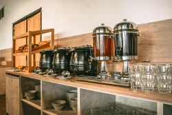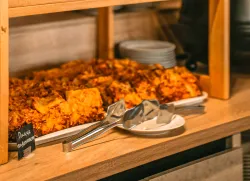 Уютную атмосферу дополняет прекрасный микроклимат, созданный специальной системой кондиционирования. Запахи с кухни никогда не попадают в зал, что позволяет наслаждаться естественными ароматами каждого блюда в тарелке. Здесь всегда можно найти разнообразные блюда, включая мясные, рыбные, овощные и фруктовые.